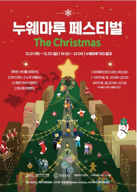 제주시 누웨마루 거리 일원에 크리스마스를 맞이하여 찾아온 산타와 반짝반짝 빛나는 아름다운 트리와 음악이 어우러져 다양한 부대행사와 이벤트로 준비된 크리스마스의 선물 같은 페스티벌입니다. 크리스마스를 맞이하여 제주 방문 시 들러보시면 좋을 듯싶습니다.
